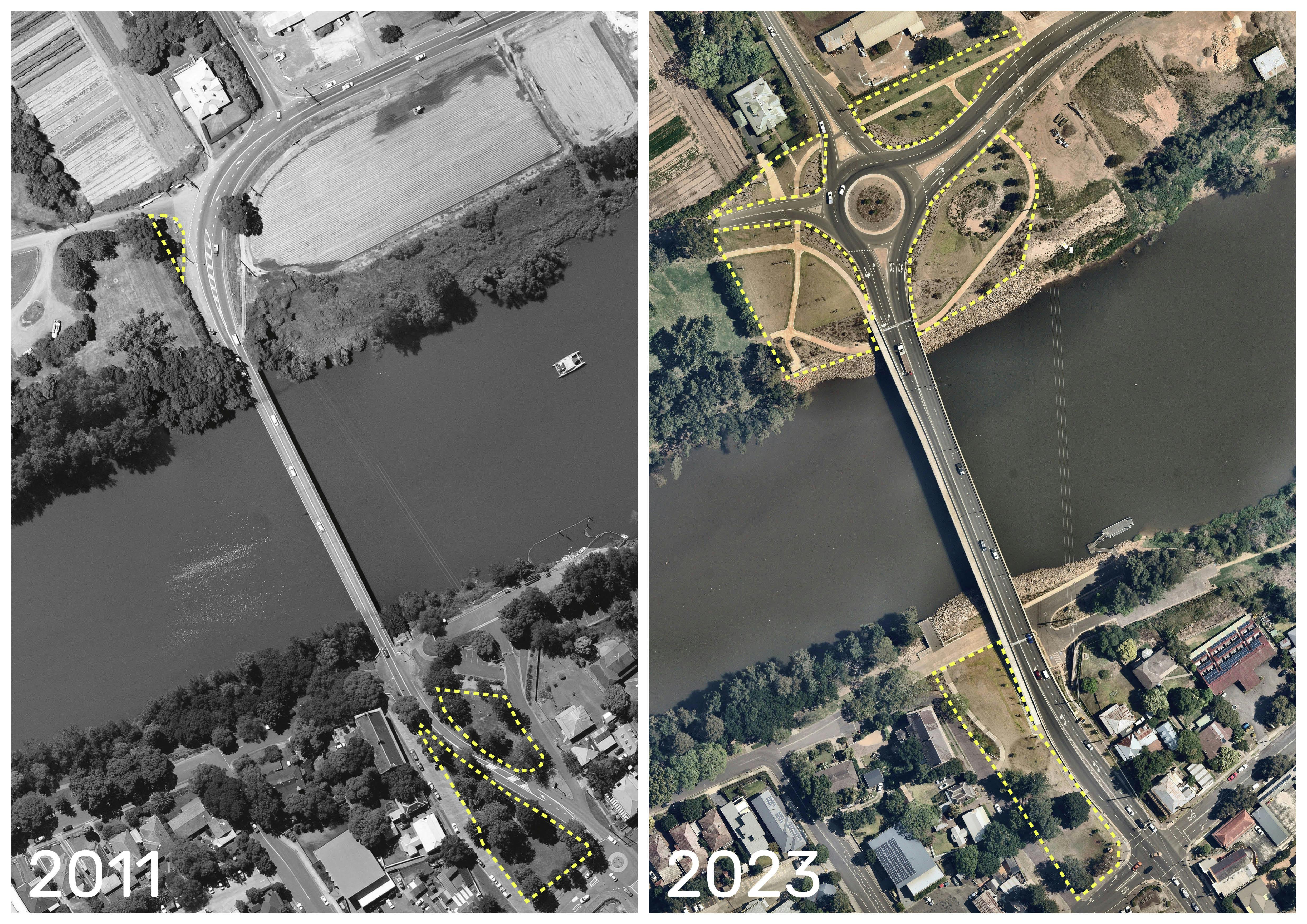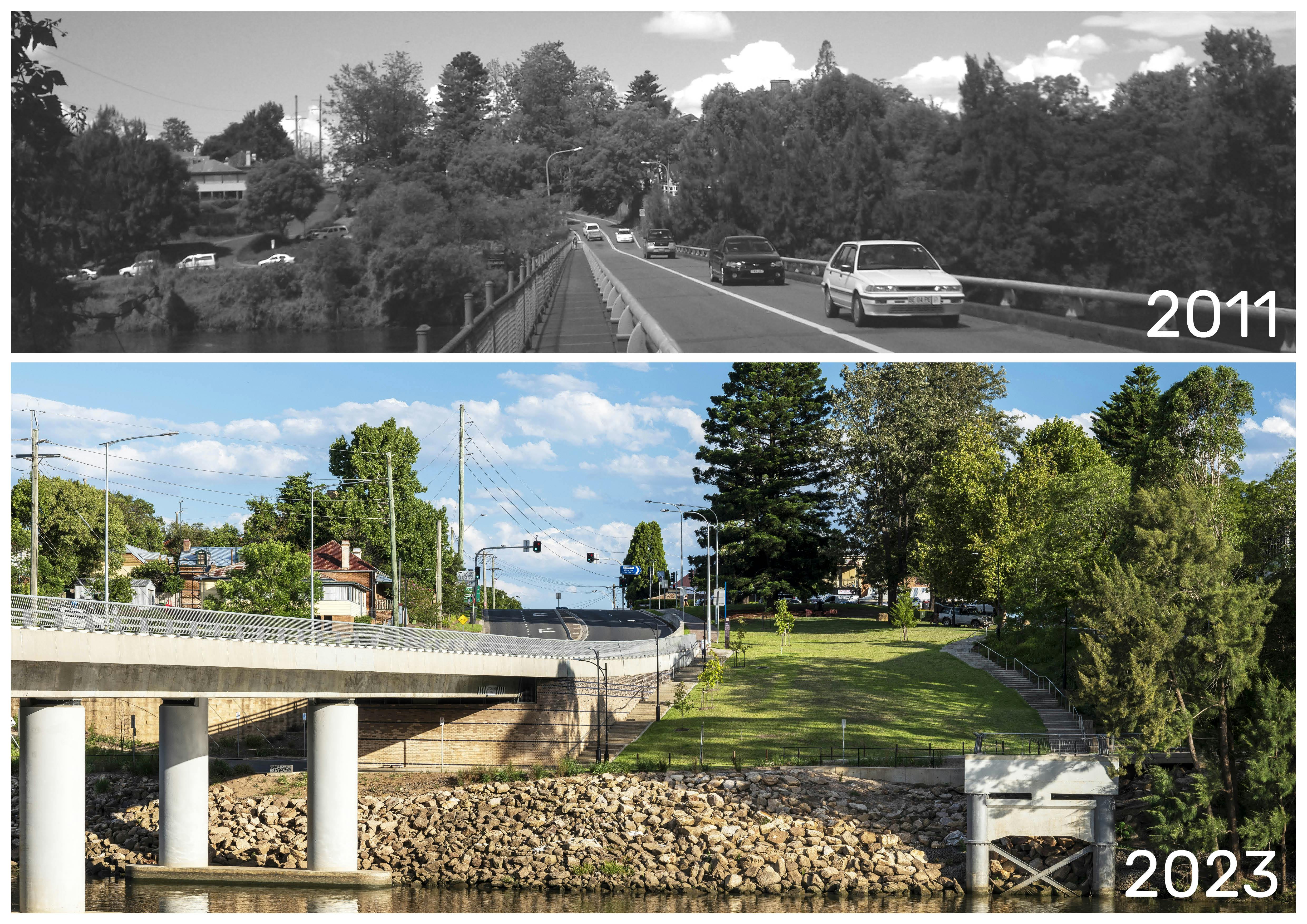 Over more than ten years the Transport Urban Design Roads & Waterways team and SMM worked together with the project team from planning to delivery, to produce a piece of transport infrastructure that provides a long term crossing for all vehicles and pedestrians, able to withstand floods, respects the heritage of the area, the landscape and community setting and leaves a legacy in the design of the Square, the bridge and its abutments, green infrastructure and active transport. The project supports economic growth and productivity by providing greater road capacity for forecast traffic volumes and safe two-way access for freight vehicles.