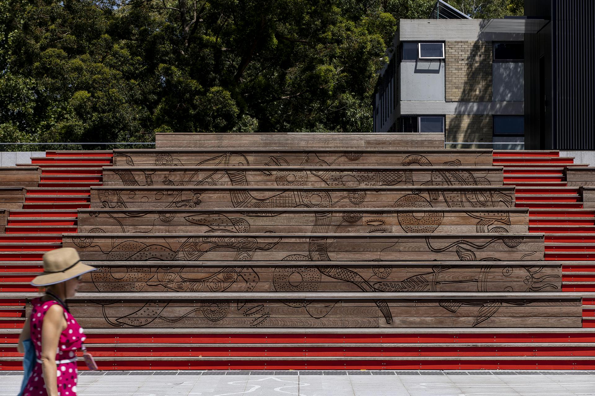 Indigenous artwork and engravings are featured in the overall design and have been produced collaboratively by Uncle Greg Simms (Gadigal/Dharug), with guidance by Aunty Marjorie Dixon (Bidjigal) and Uncle Assen Timbery (Bidjigal) and interpretations by Danièle Hromek (Budawang/Yuin) and Samantha Rich (Wiradjuri), Wonder See Discover. The Park also celebrates the success of UNSW Alumni incorporating bronze plaques into the central spine called Alumni Walk.