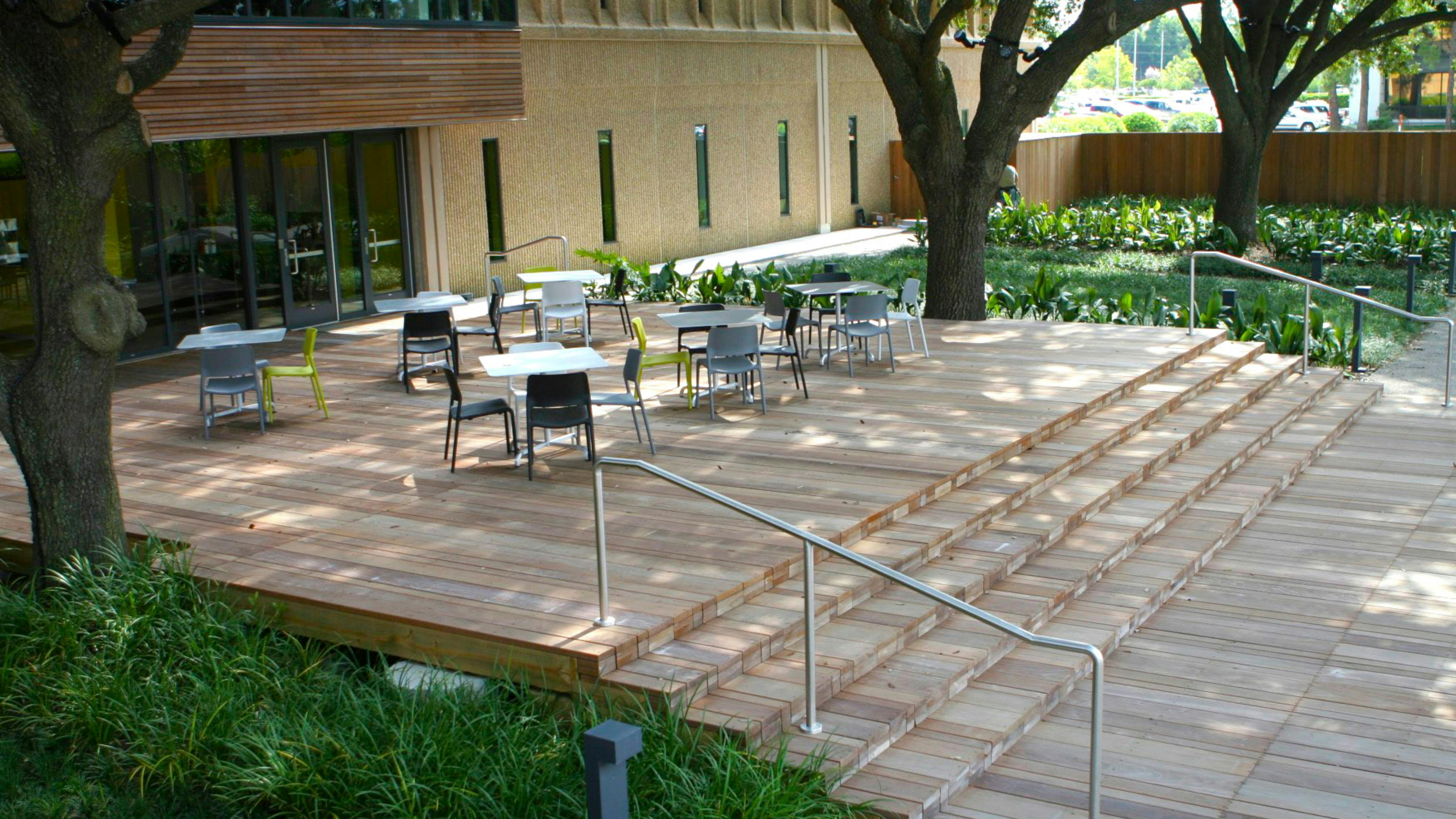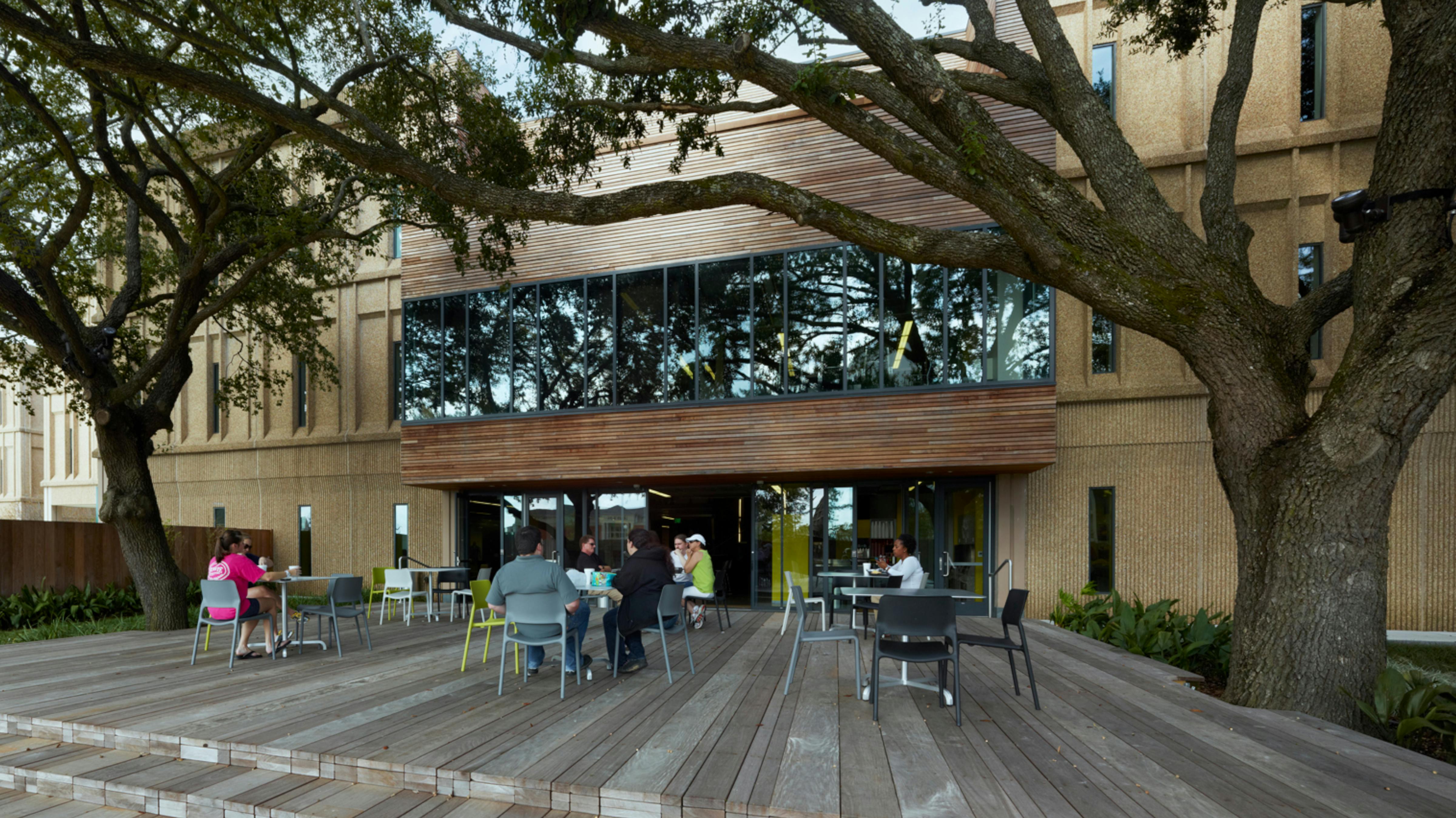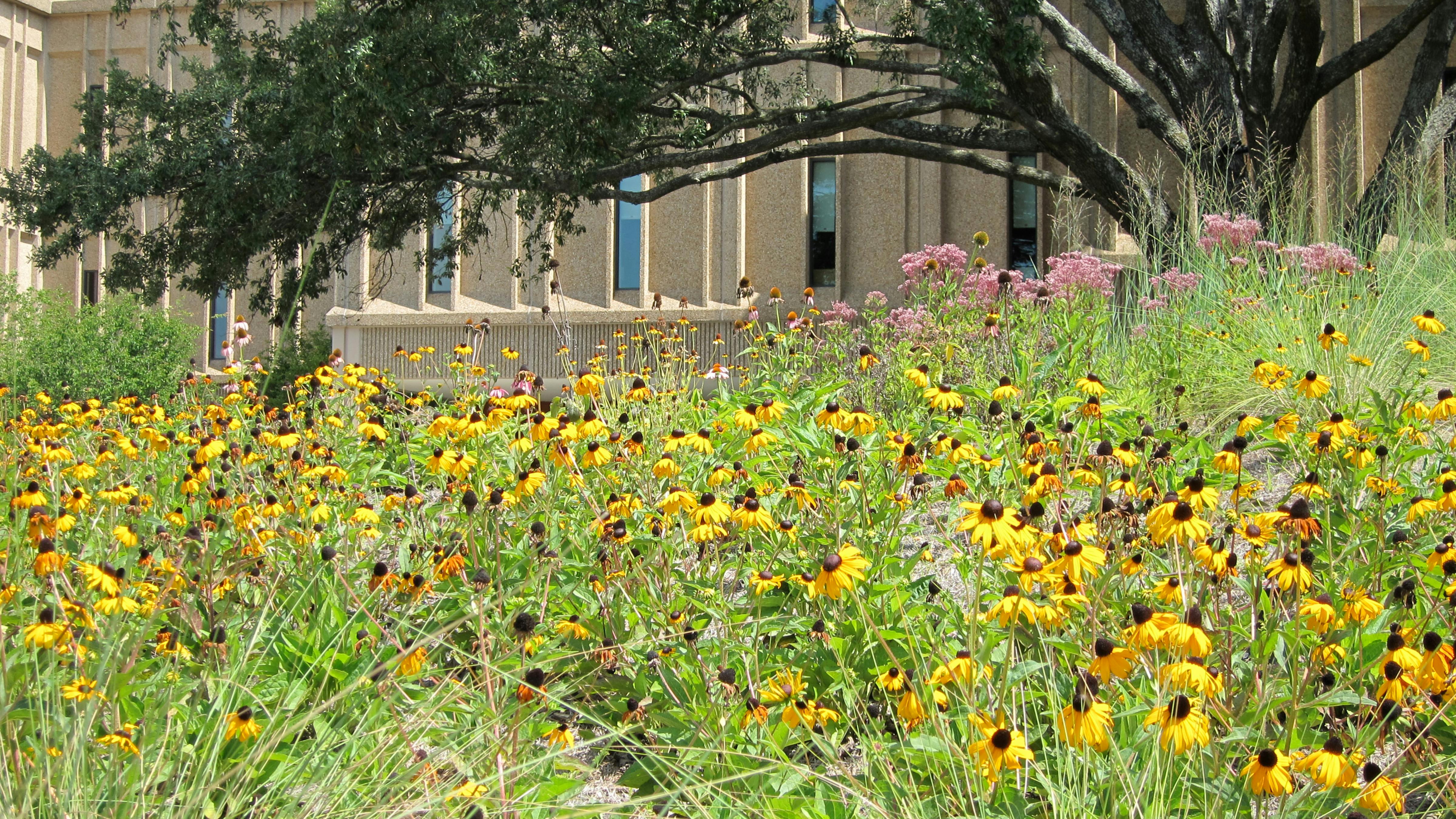 Lamar Advertising’s headquarters in Baton Rouge is a building renovation project with the incorporation of several courtyards, both inside and outside of the building. The front courtyard serves as an everyday employee outdoor break room and also as a special occasion space for employee parties and picnics. The space was designed around four existing Live Oak trees. To give the space privacy, a large berm with a wildflower meadow planting was incorporated into the design. The berm gives definition to the interior of the space, while providing a rich experience to the person traveling along the exterior of the site. Design work for the project also included an interior courtyard/green roof.