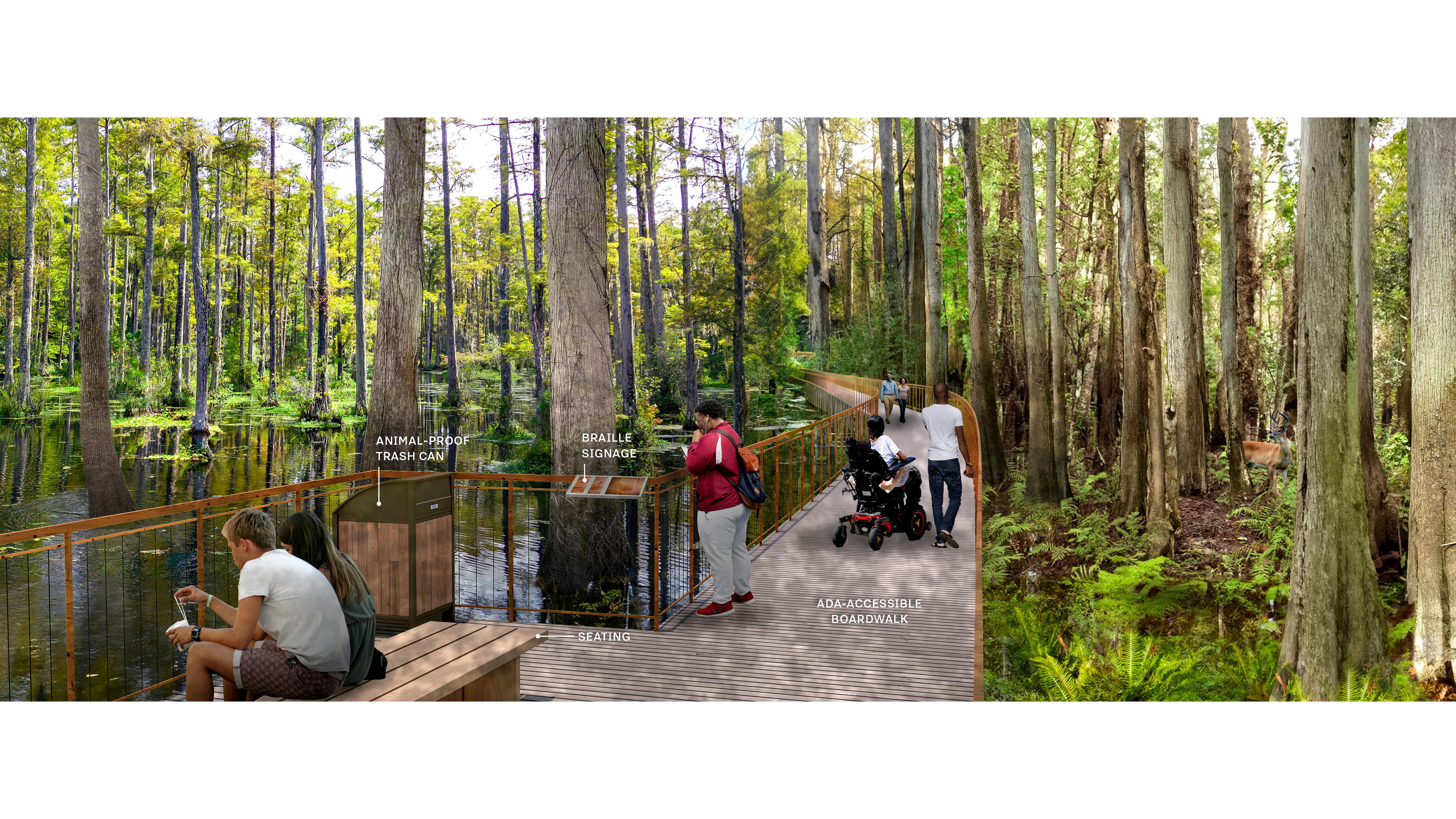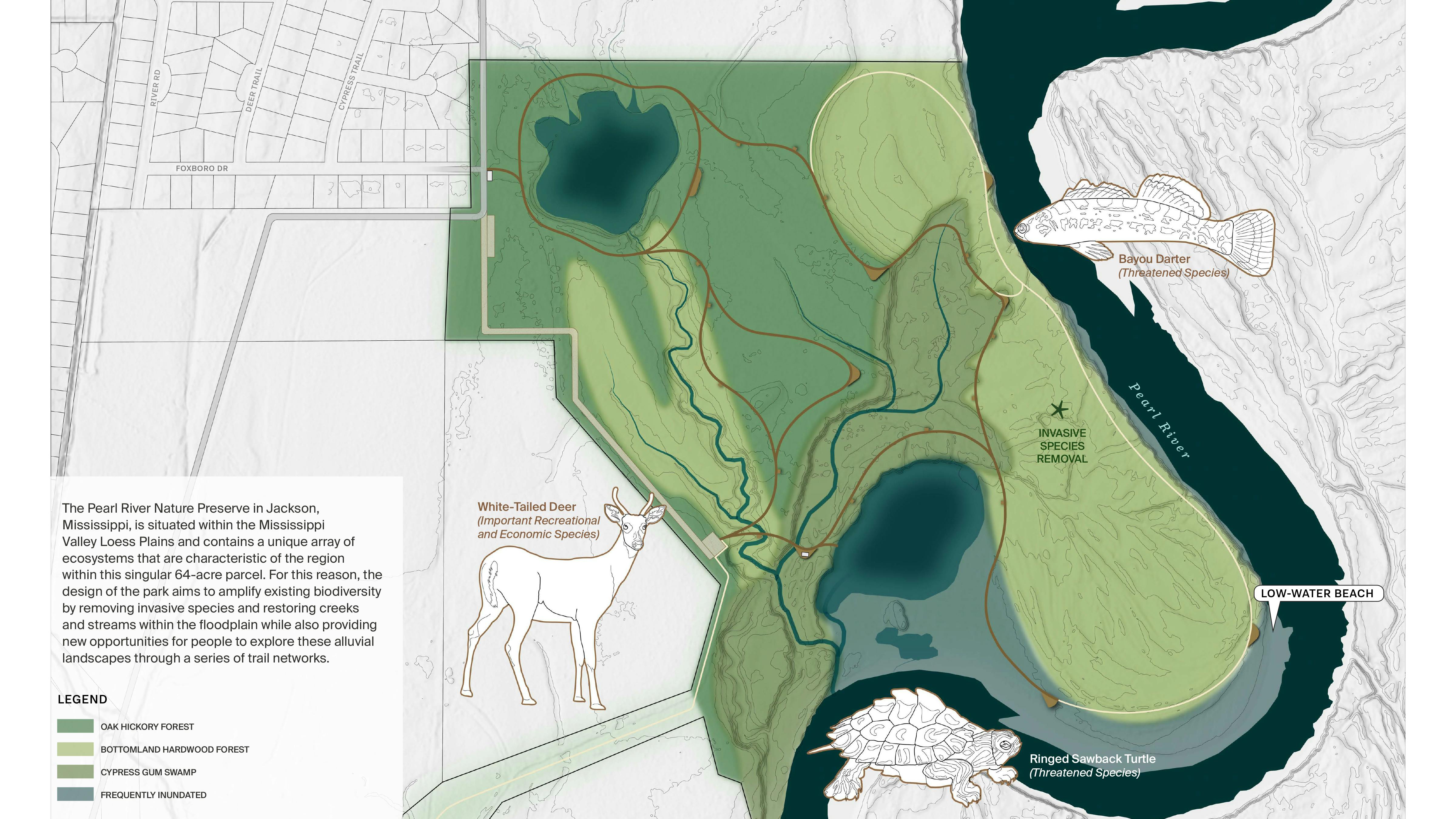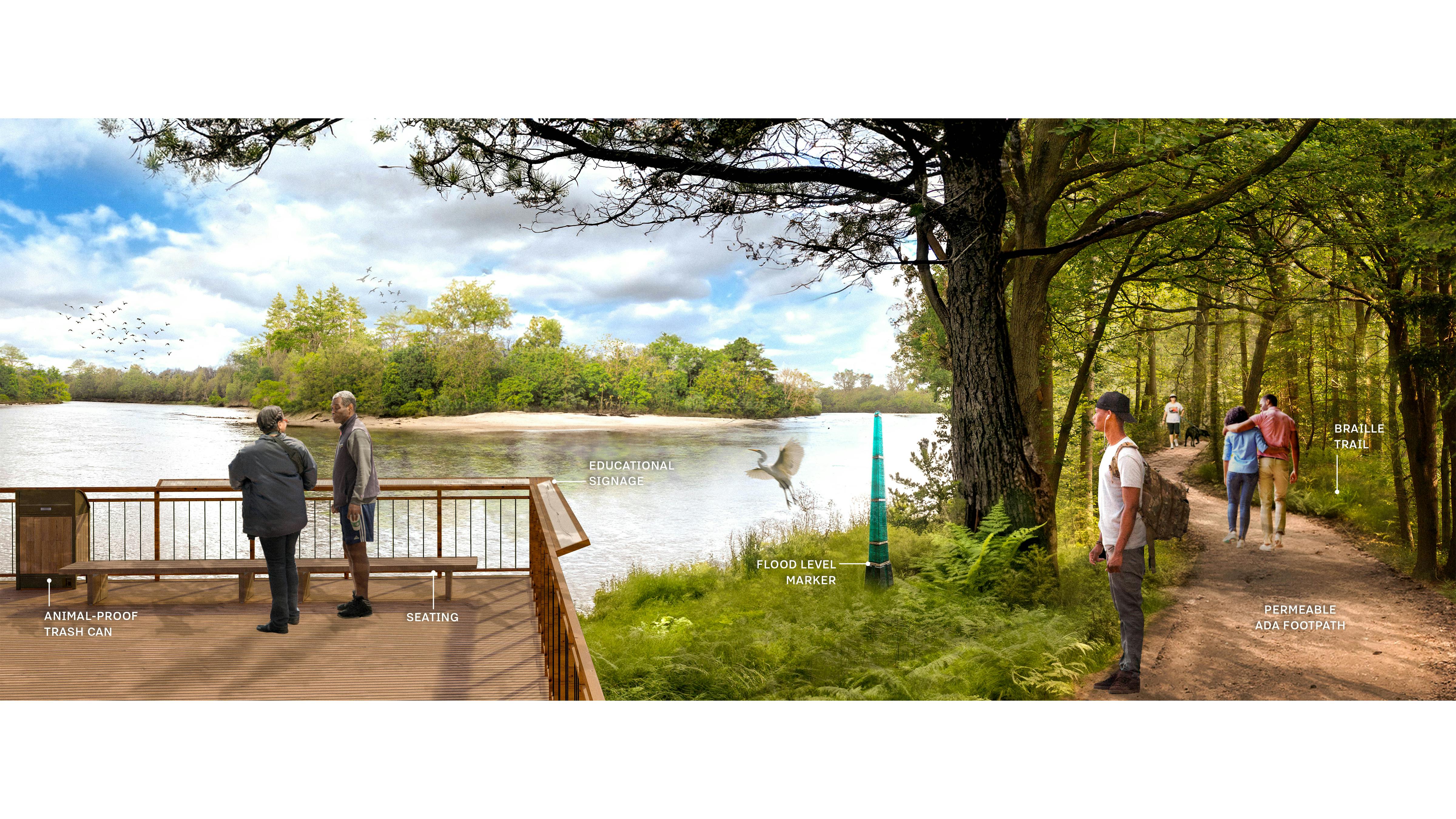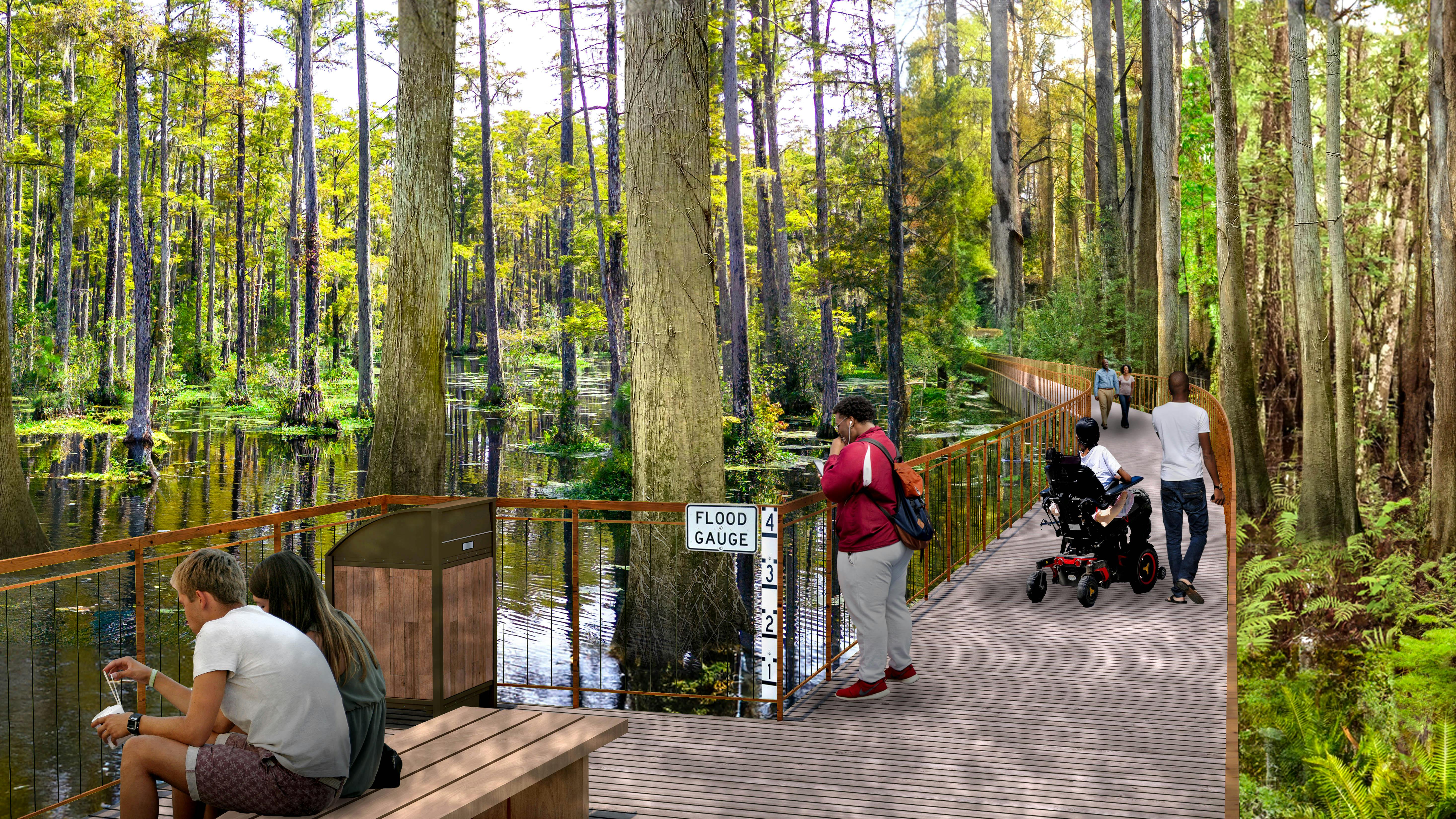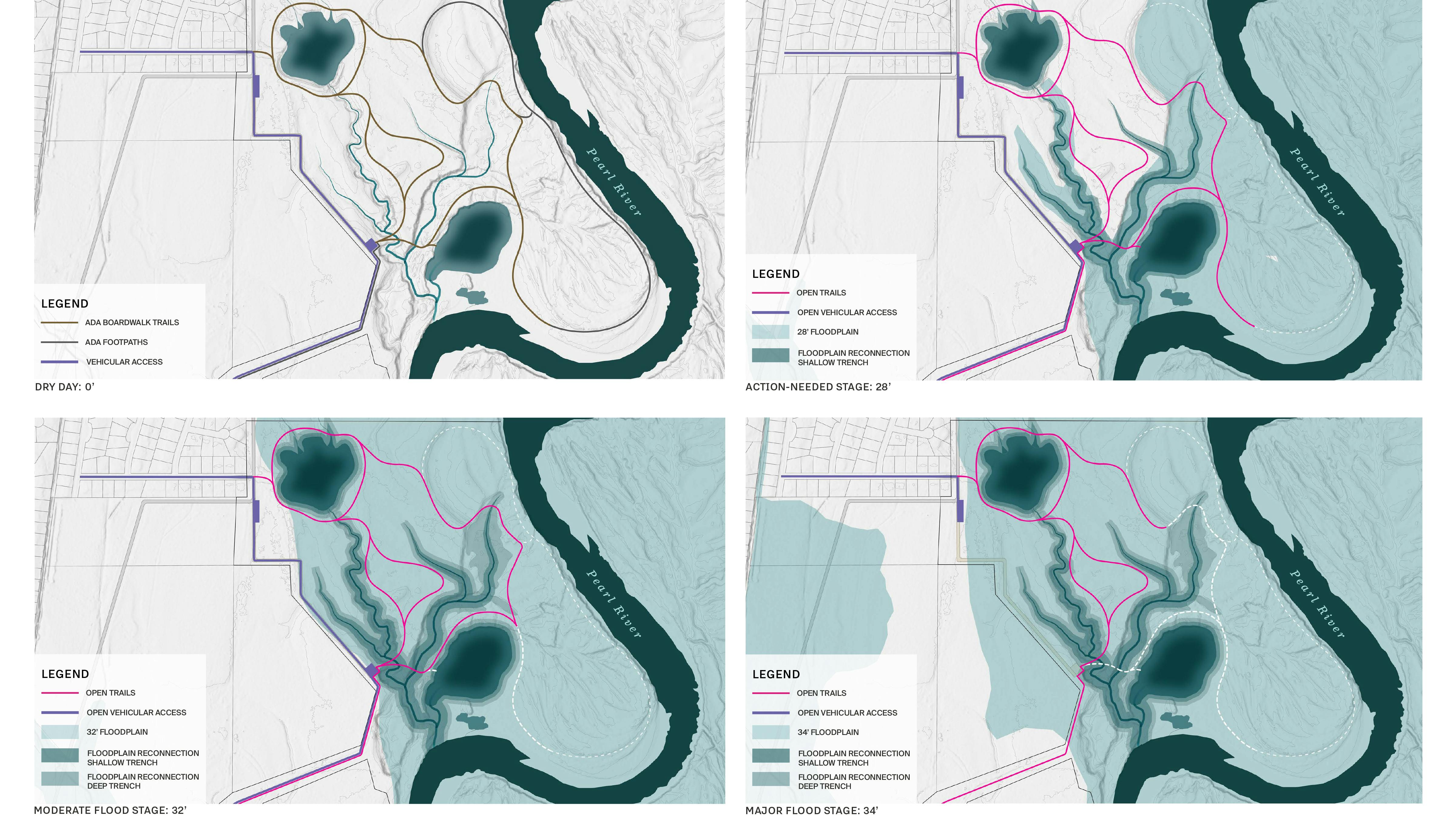 In response to these challenges, three neighborhoods — Canton Club, Parkway, and McLeod — have come together through Mississippi Communities United for Progress (MCUP) to develop a vision for a more resilient Northeast Jackson. This vision centers on the creation of the North Jackson Nature Preserve, a dynamic space designed to serve as both a buffer against flood events and an accessible recreational area for all residents. The preserve aims to demonstrate how nature-based solutions and green infrastructure can effectively address flooding issues while providing much-needed open space. By incorporating ADA-accessible features, the project ensures inclusivity, allowing all community members to benefit from and enjoy the space.