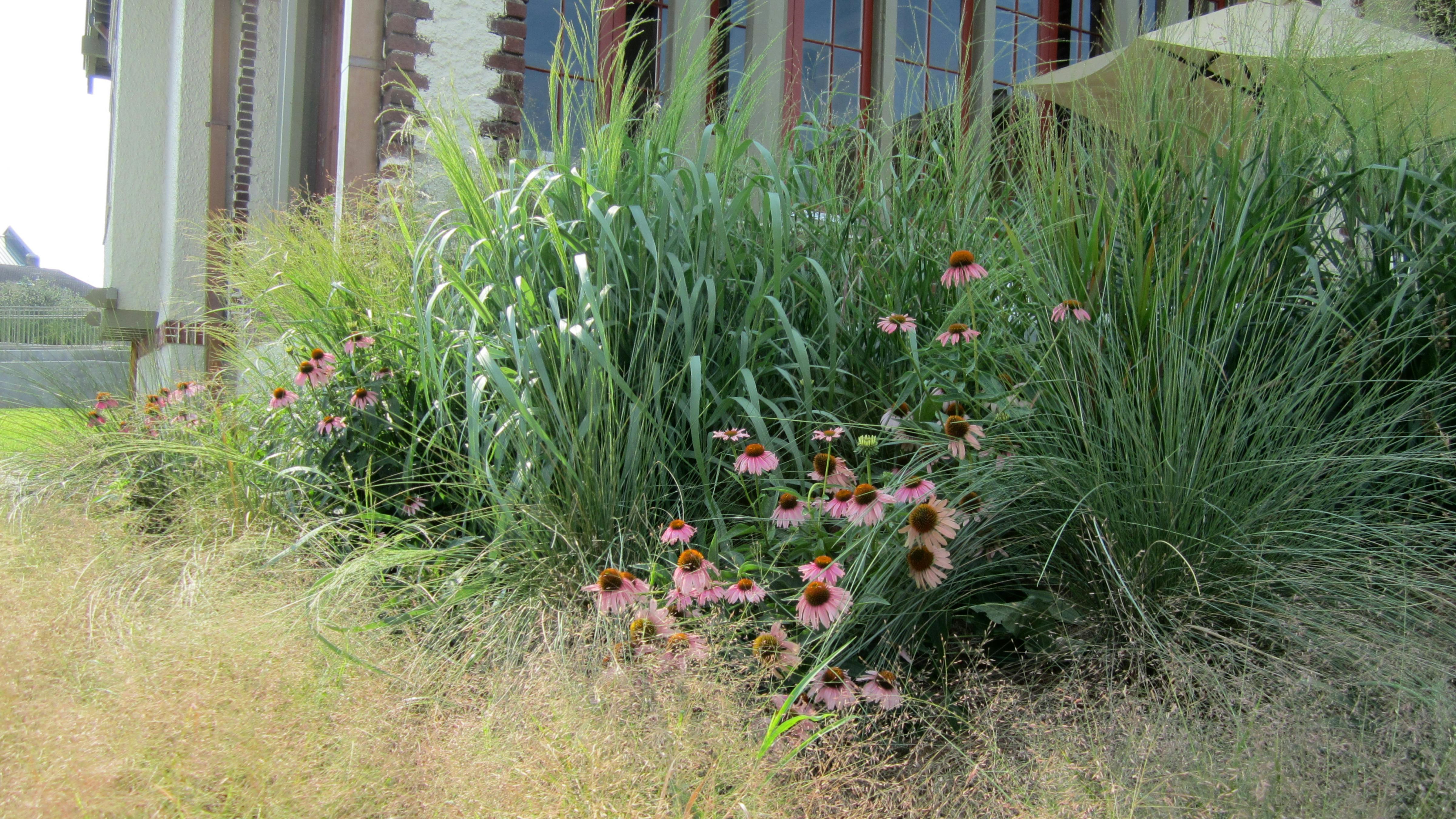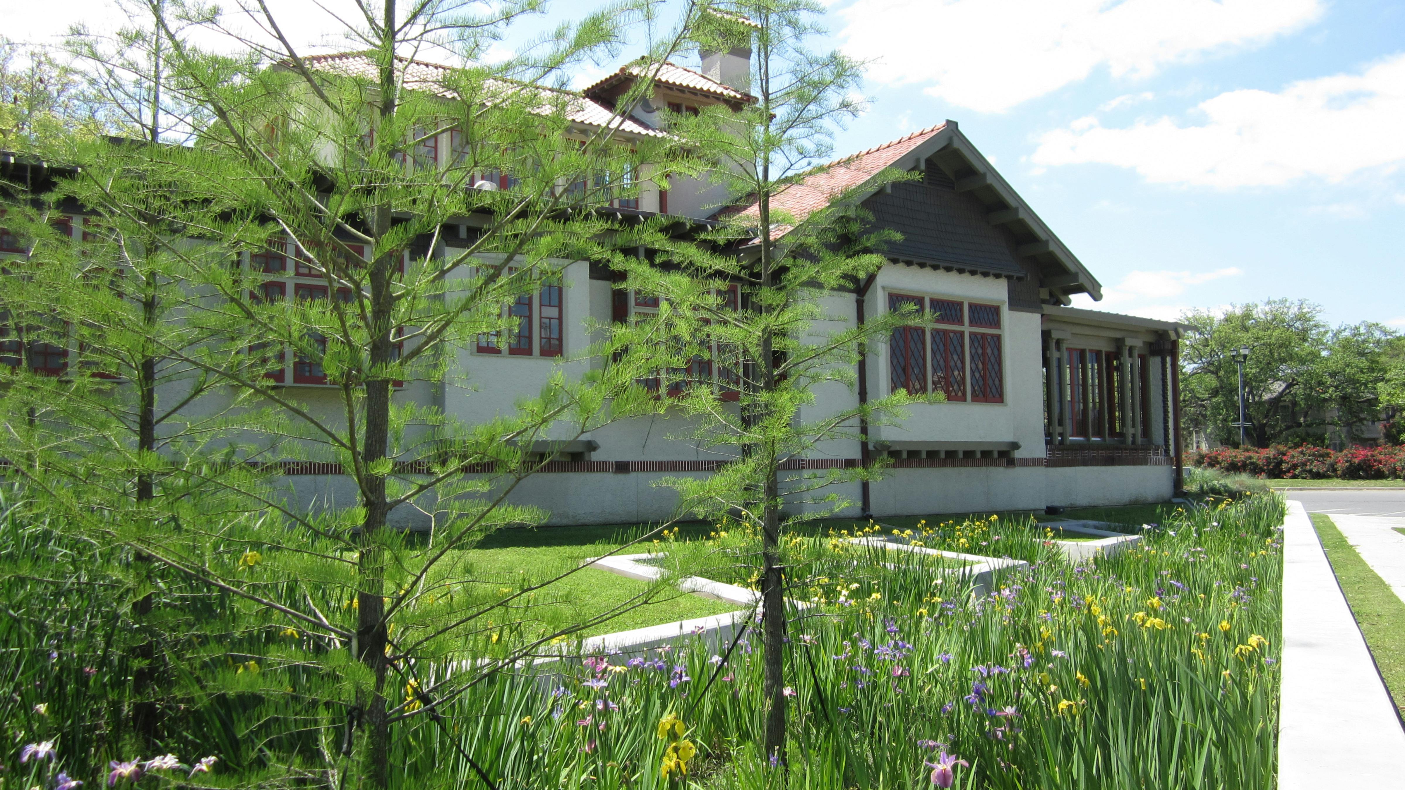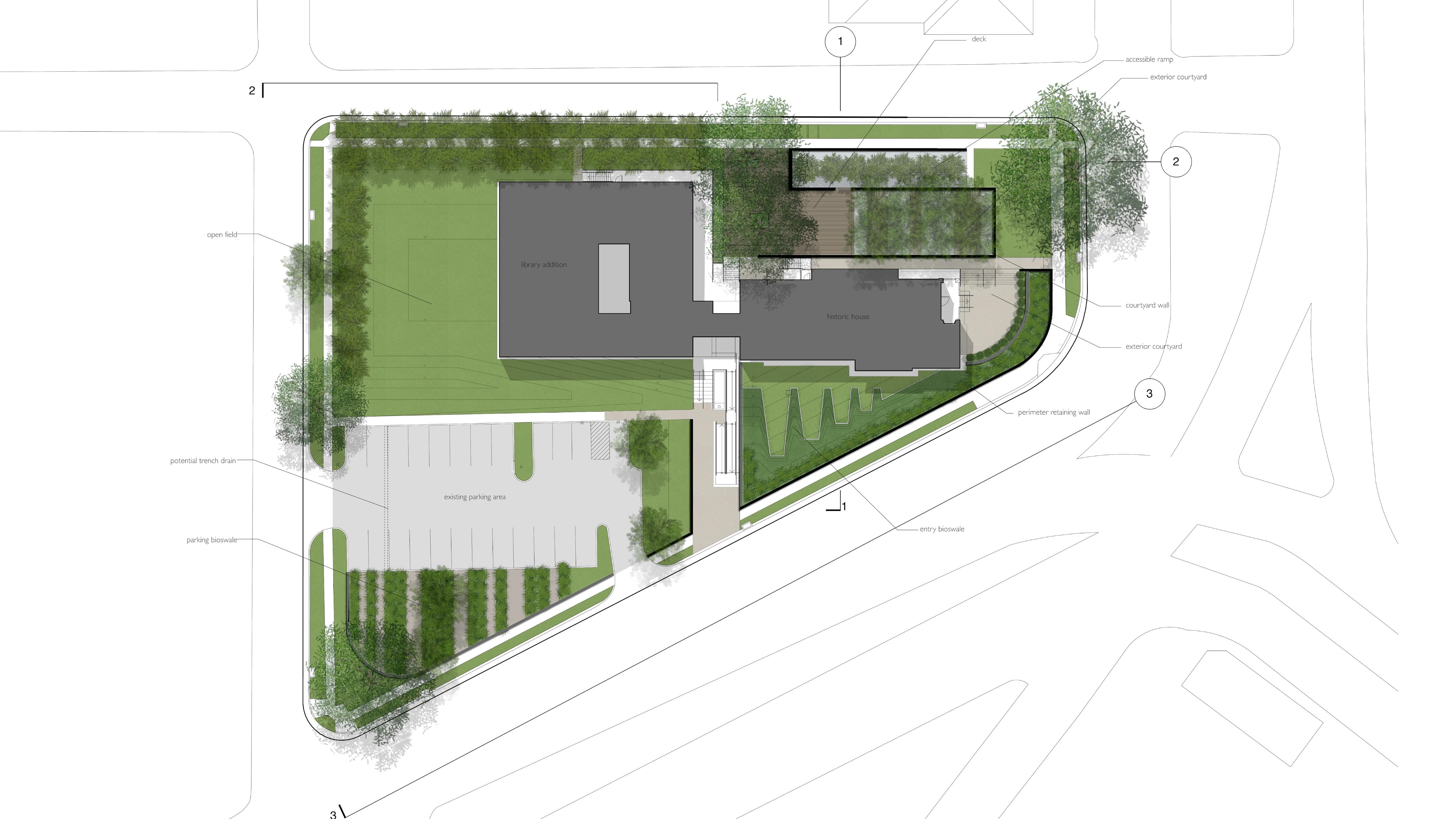The water from all of the roof surfaces is integrated into the landscape in a series of detention basins and Rain Gardens. This project is a demonstration of the potential for municipal spaces in New Orleans to help remedy localized flooding and reduce pressure on the aging infrastructure of the city. Of interest is the incorporation of stormwater from a new addition as well as from an existing building renovation. The existing library building was retrofitted with a roof drainage system that was tied into the overall stormwater strategy.