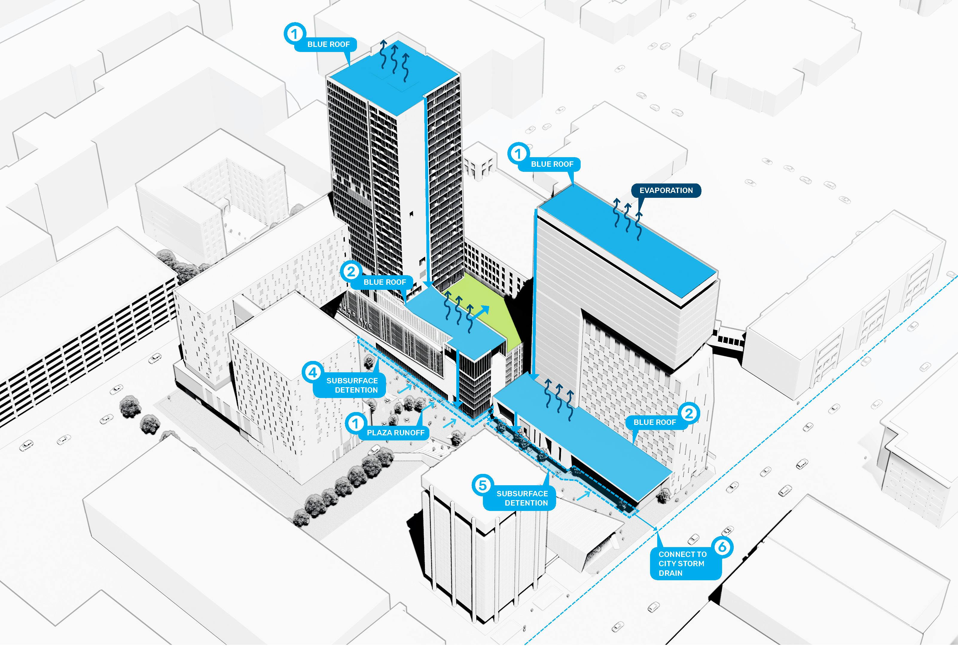 Stormwater management is a driving force for the landscape, which is heavily programmed with little open green space, yet is required by City ordinances to fully manage all water on site. Cost-benefit analyses were performed with the construction management team to balance the environmental and budgetary needs for the project. Stormwater capture and cleansing systems that also provide irrigation water for trees and adjacent landscapes are also integrated into the overall design, providing multiple benefits to the project.