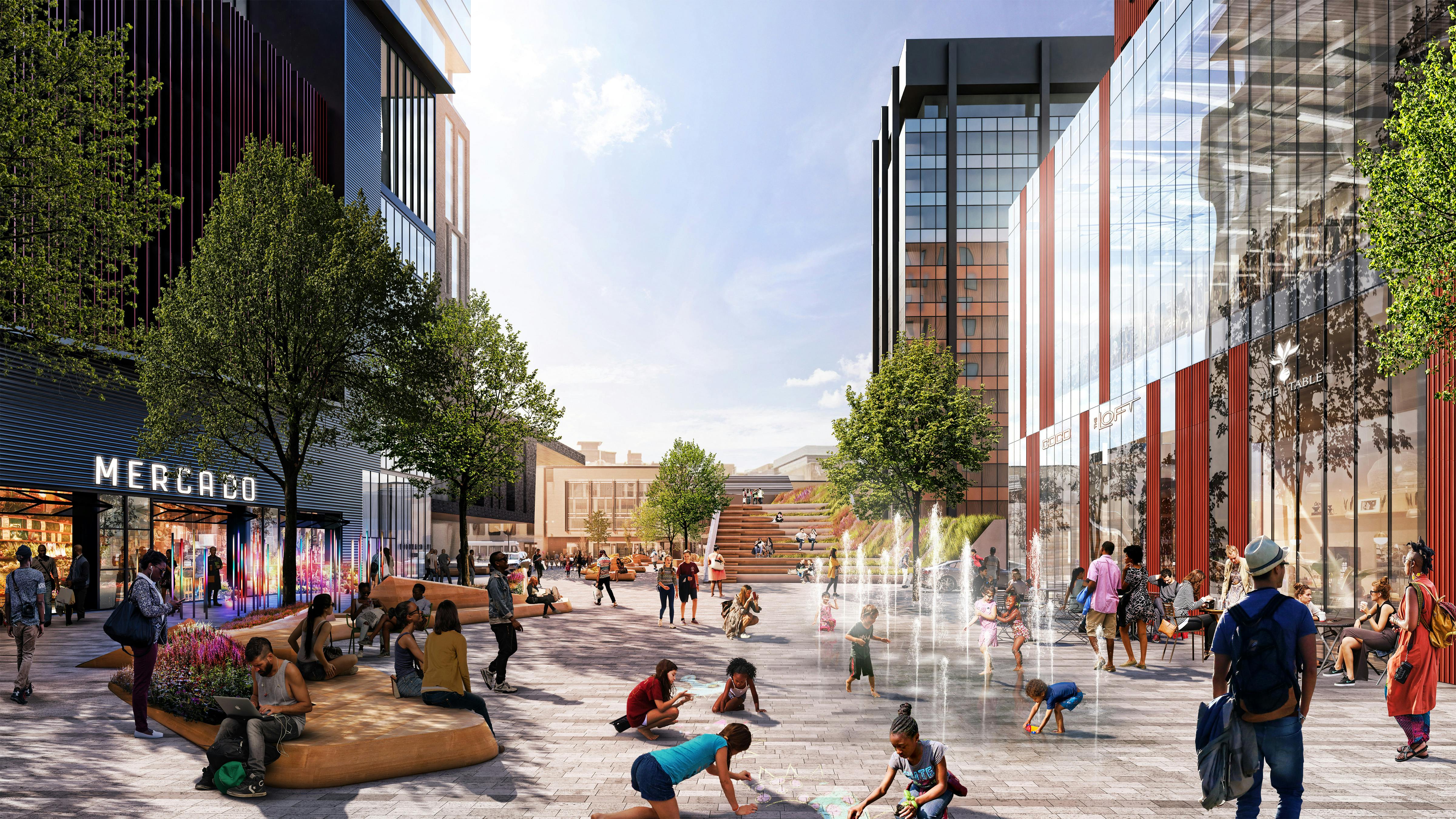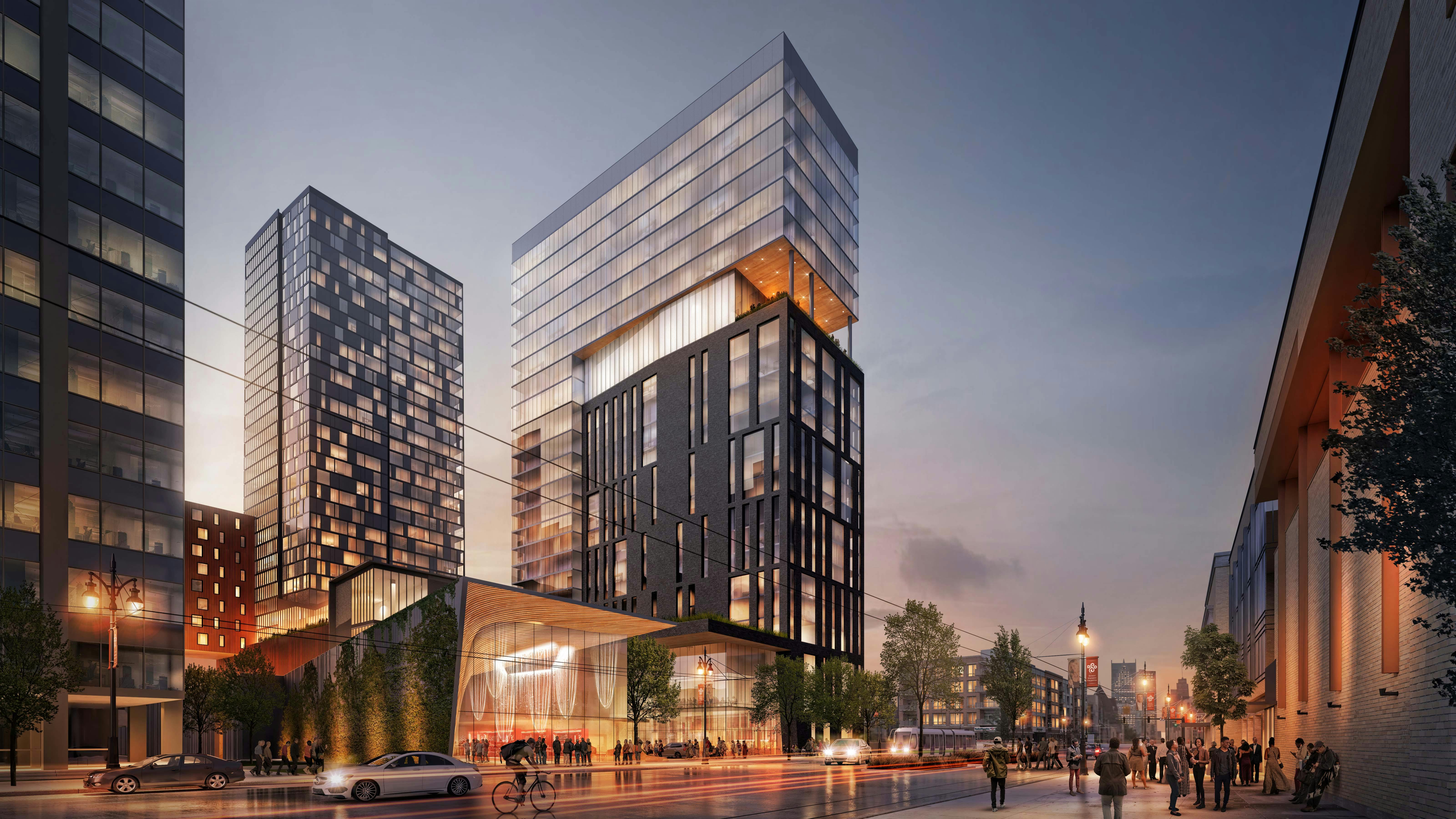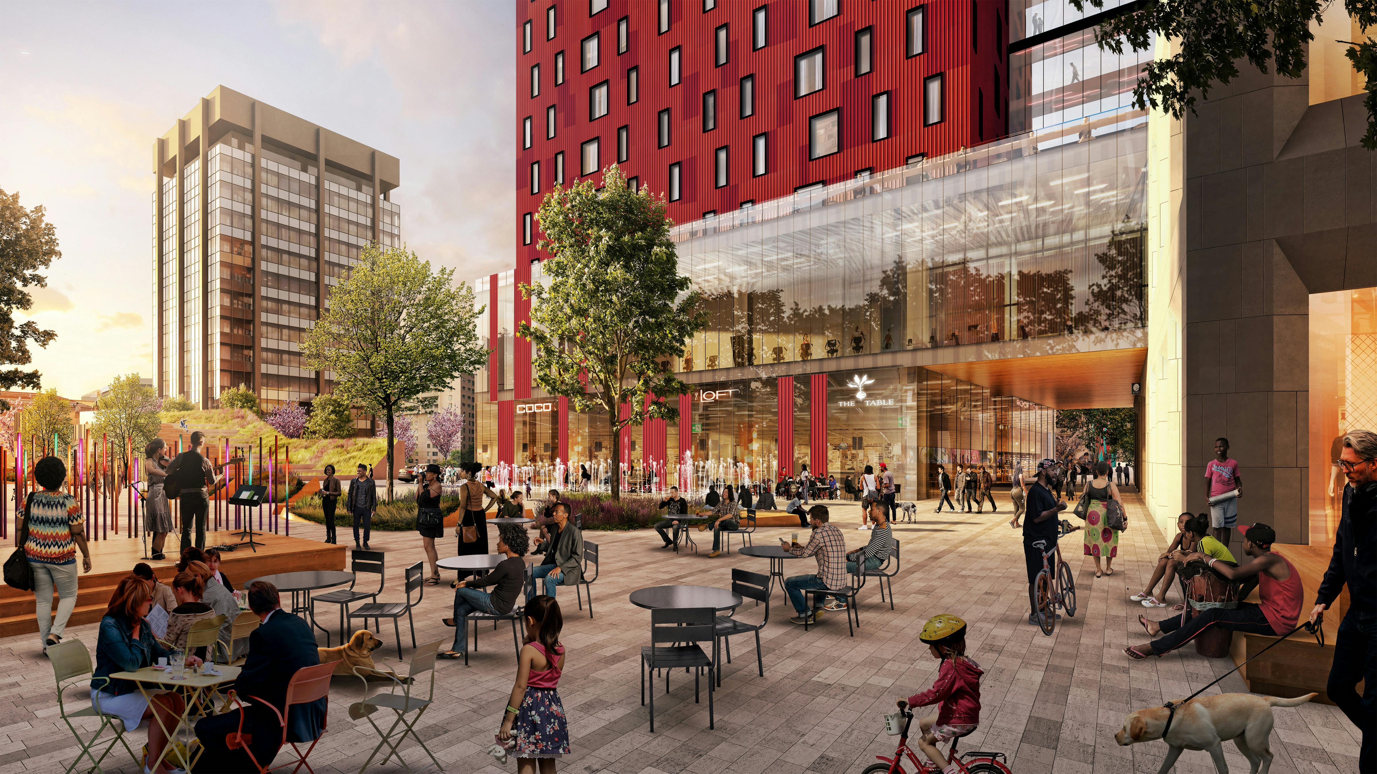 The site is a shared-use plaza with hotel drop-off and circulation for resident parking integrated with pedestrian and event spaces. This approach prioritizes the pedestrian experience while allowing for the needed automobile circulation to occur on the site. A parking structure under the plaza for the majority of the site means that much of the landscape is built on top of the structure, requiring careful consideration for the placement of trees, the use of lightweight materials, and innovative stormwater management techniques.
