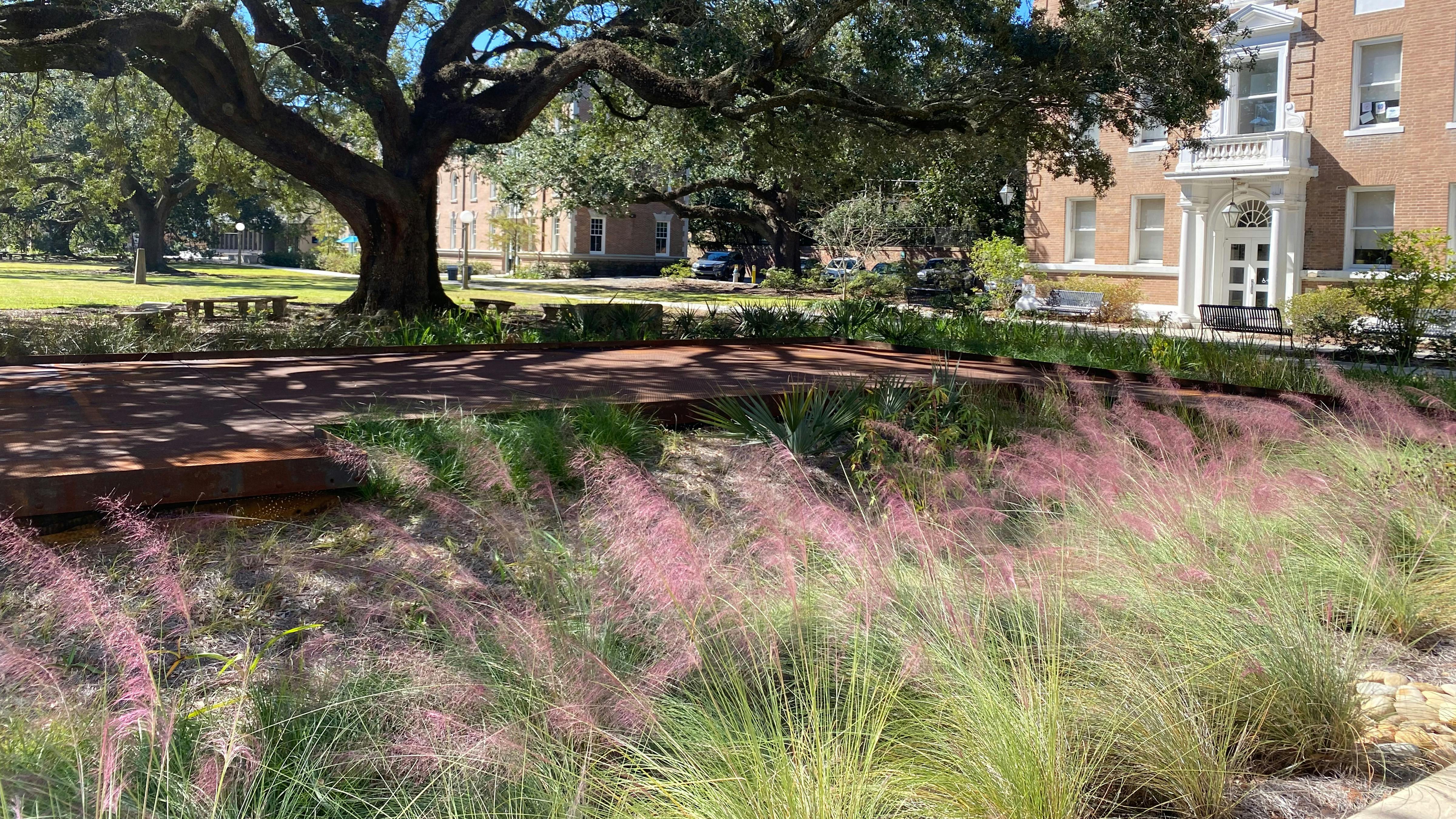 Beyond the stormwater management aspects of the project, the gardens are a showcase for native Gulf Coast plants that can handle the rigors of a wet/dry biodetention application. The project highlights a dynamic approach to planting where plantings are allowed to change seasonally and from year to year. The garden demonstrates the aesthetic potential of these dynamic landscapes for students, faculty, and administrators to evaluate as a potential approach to make the landscape on campus more ecologically rich.